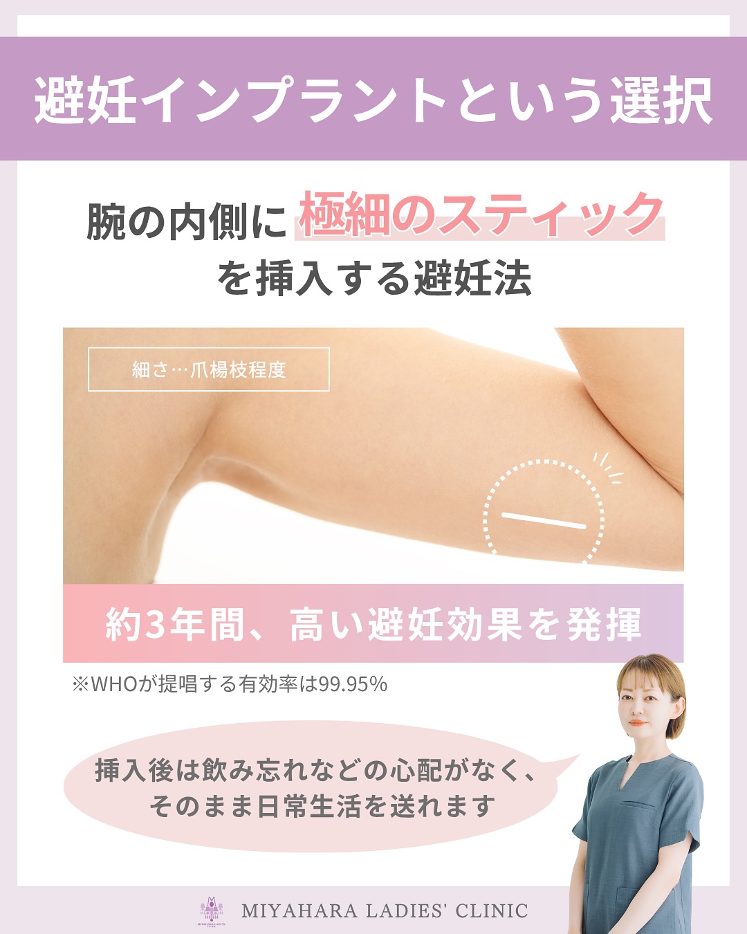避妊インプラントは、長期間にわたって安定した避妊効果が得られる選択肢として、忙しい毎日を送る方やピルの服用が難しい方に選ばれています。