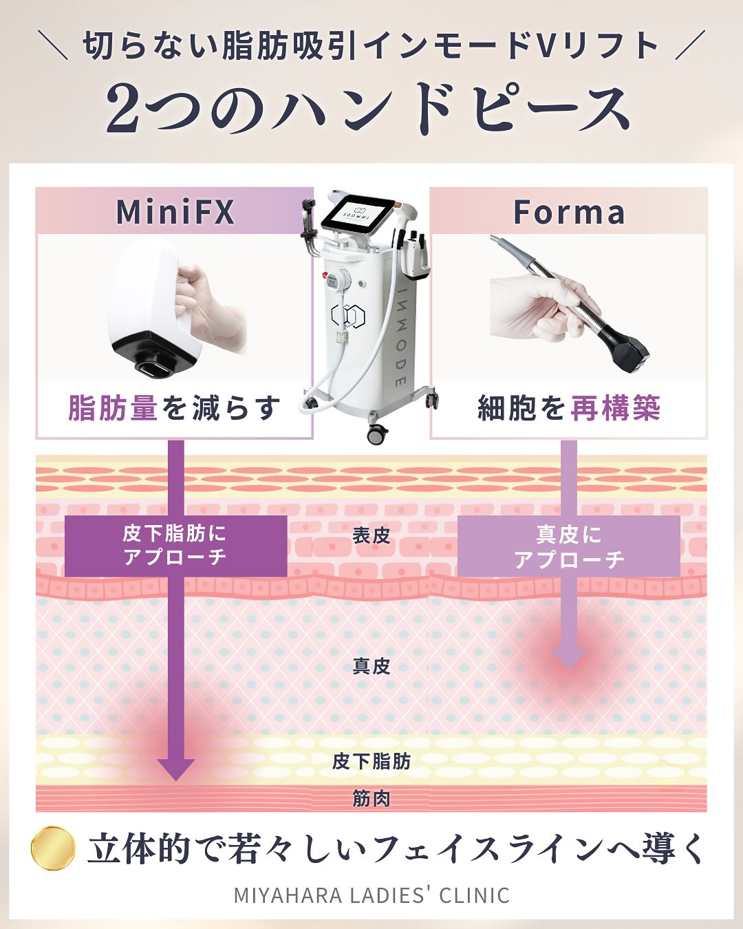 フォーマは単体で施術可能ですが、同じくインモード社製で皮下脂肪にアプローチできるハンドピース「Mini FX」と組み合わせた「インモードVリフト」の施術も可能。