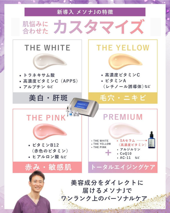 当院では、4種類のコース(THE WHITE、THE YELLOW、THE PINK、THE PREMIUM)を導入しています。この4種類をベースに、肌状態に応じて10種類の有用成分から必要な薬剤をカスタマイズ配合できます。