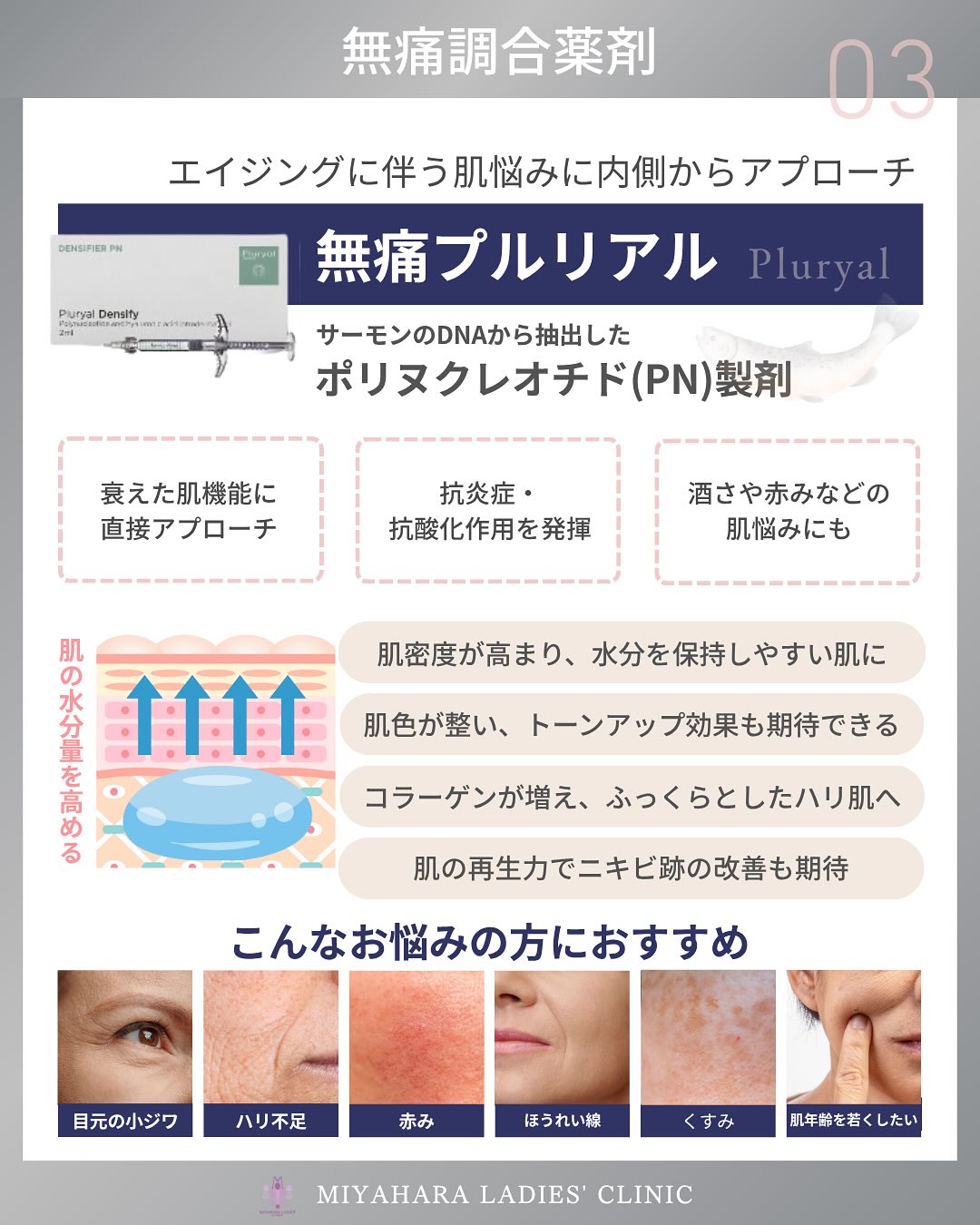 プルリアルとは、“予防”と“修復”にフォーカスした、肌の再構築をサポートする肌育注射です。 みやはらレディースクリニックでは、サーモン由来のポリヌクレオチド(PN)と非架橋ヒアルロン酸、肌を整えて効果の持続力を高めるマンニトール を組み合わせた「Pluryal® Densify(プルリアルデンシファイ)」を導入。同じく、ポリヌクレオチドを主成分とした目元専用製剤「Pluryal® SILK(プルリアルシルク)」 もご用意しています。