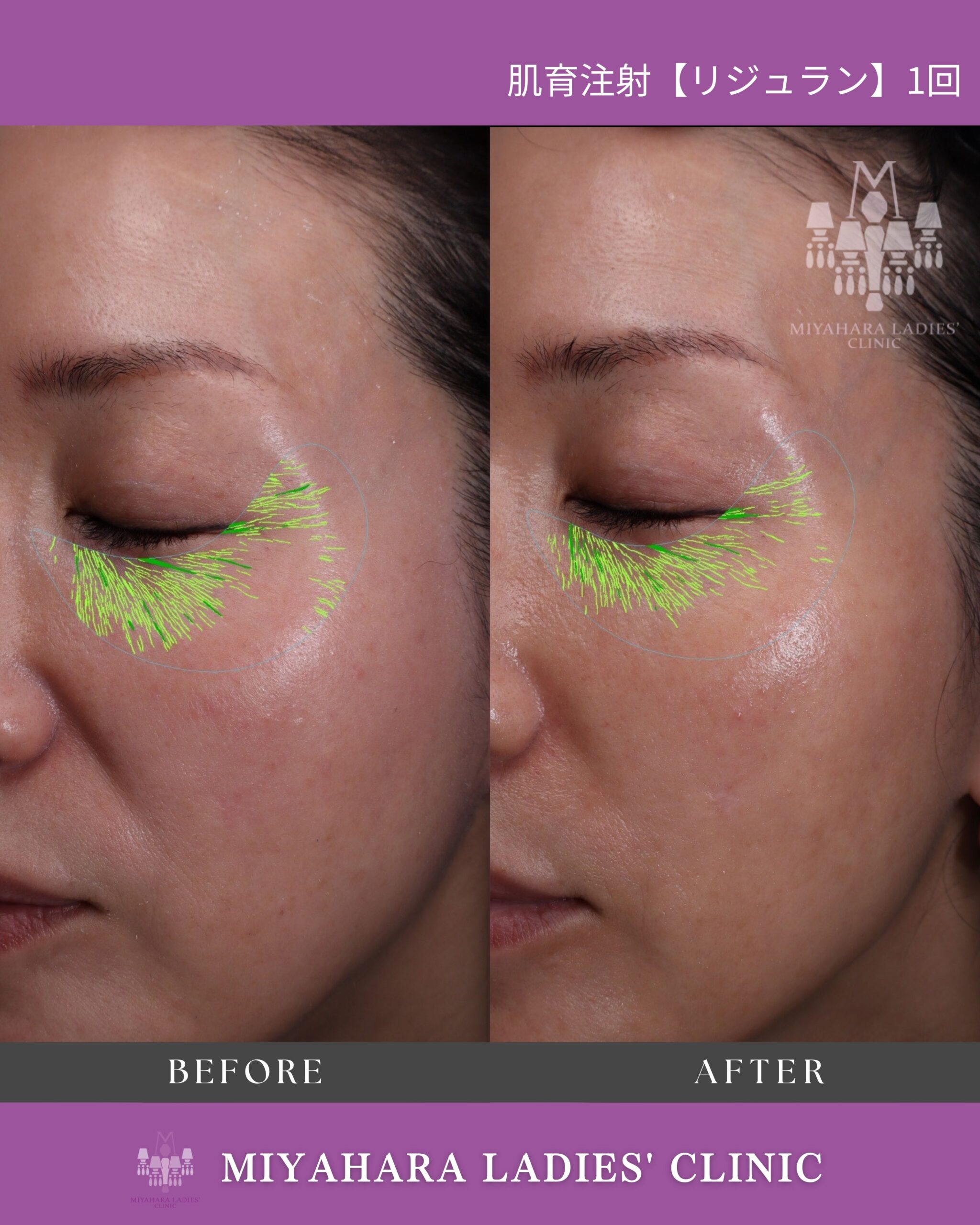リジュランには複数の種類がありますが、みやはらレディースクリニックでは、リジュランとリジュランi(リジュランアイ)を導入。リジュランiは皮膚が薄い目元やデリケートな口周りに適した製剤です。粘度が低くなじみやすい特性があるため、目周りの小じわや目の下のクマなどの悩みにはリジュランiを使用します。
