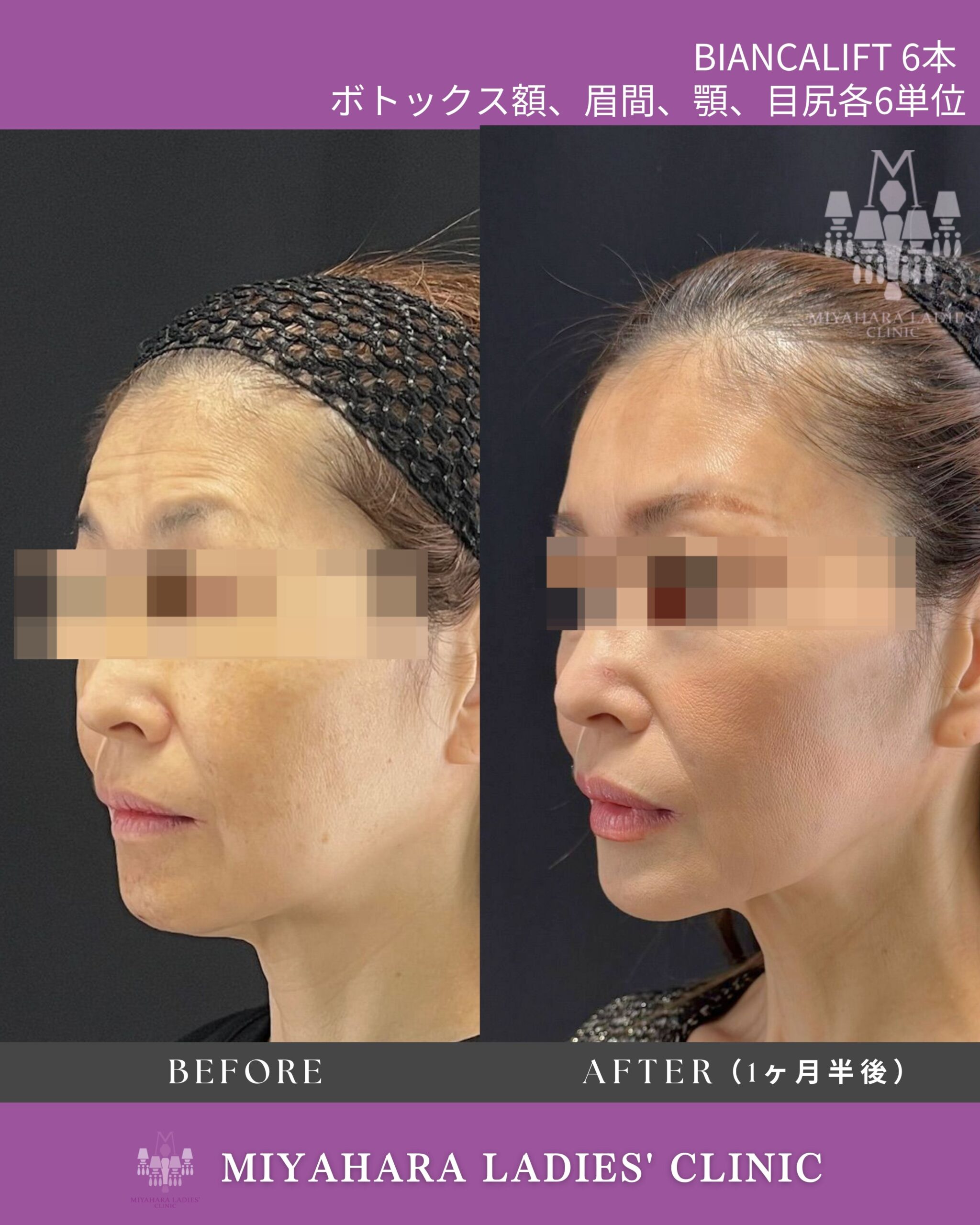 施術期間・回数 1回(ボトックス注射:顎、額、眉間6単位ずつ、BIANCALIFT左右各3本)
