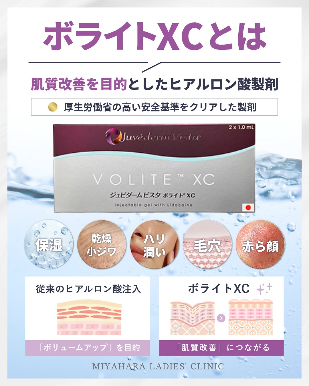 「ボライトXC」は、アラガン社製「ジュビダームシリーズ」のうちの1つで、【顔面及び頸部における小ジワ等の表面のへこみ修正及び皮膚状態の改善を目的】で安全性と有効性について厚生労働省から承認済みの製剤。