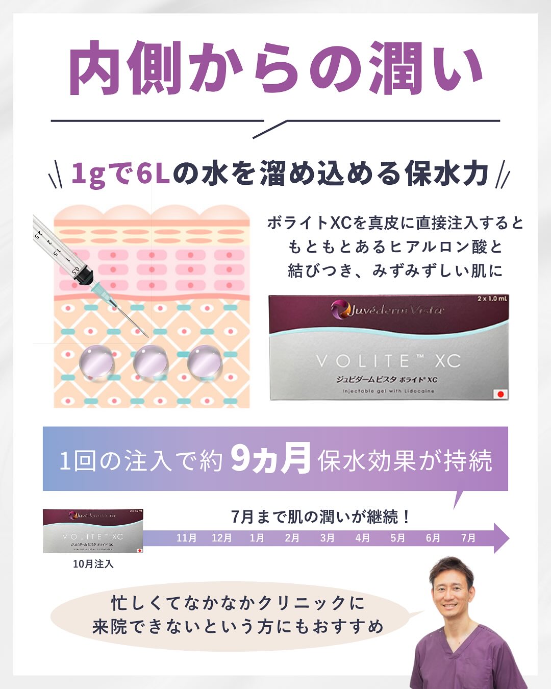 「ボライトXC」の持続期間は約9ヶ月とされており、個人差はあるものの効果が長く続きやすい点もメリット。忙しくてクリニックに頻繁に通えそうにない方でも、定期的なメンテナンスとして続けやすい施術です。