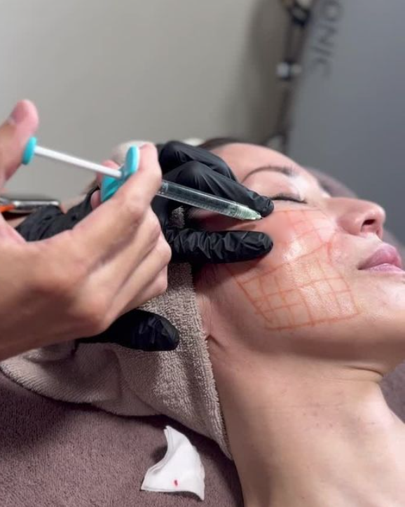 - 注入部位のメイクを落としてから、施術開始です。希望される方には麻酔クリームを塗布し、麻酔の効きを確認してから注入を行います。肌に0.5〜1cm間隔でマーキングし、極細の注射針を使って肌の真皮深層に均一に注入します。