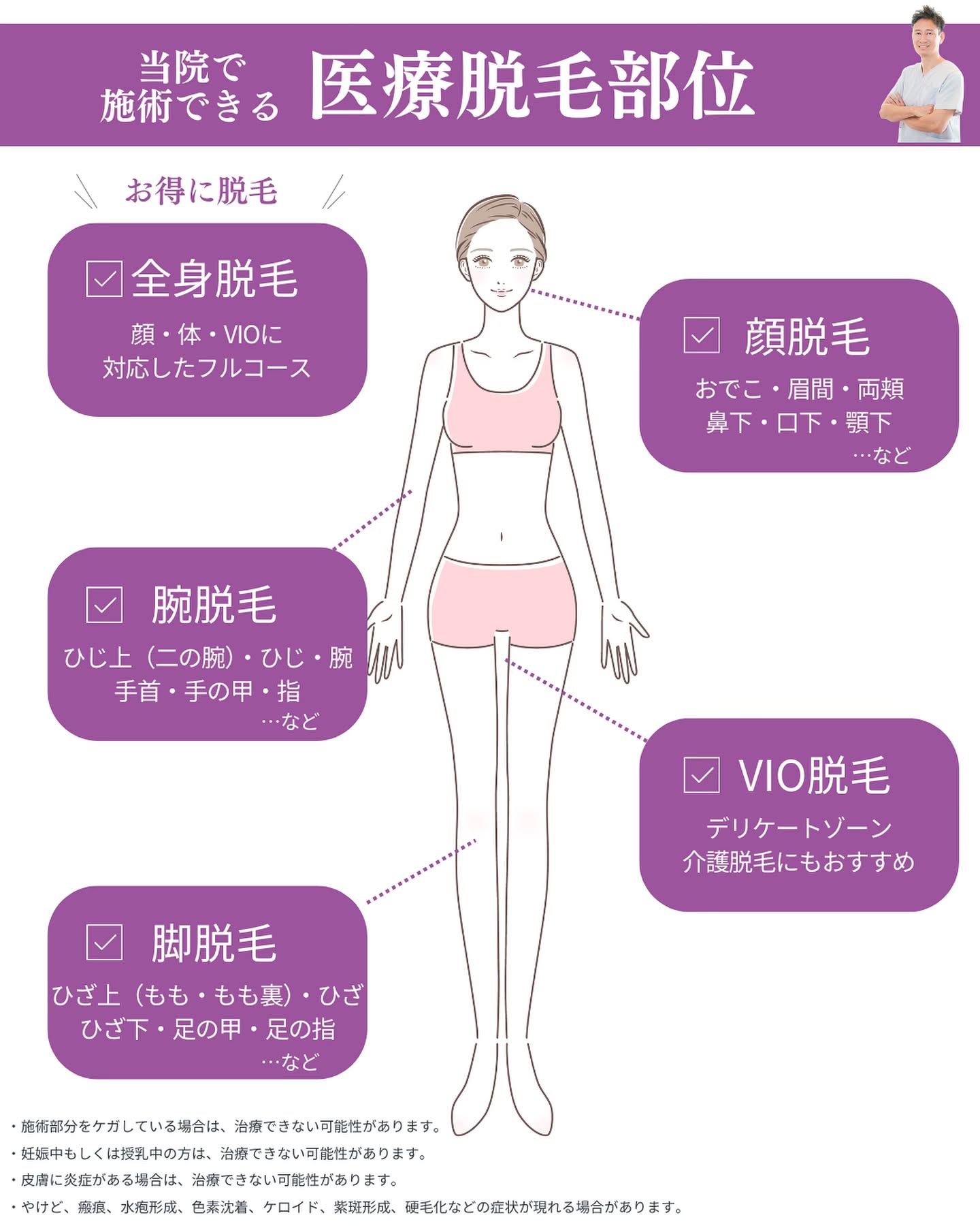 ・施術後にやけど・瘢痕(はんこん)・水疱形成・色素沈着・紫斑形成・硬毛化・ケロイドなどの症状が現れる場合があります。肌に異常が現れた場合はすぐにご相談ください。